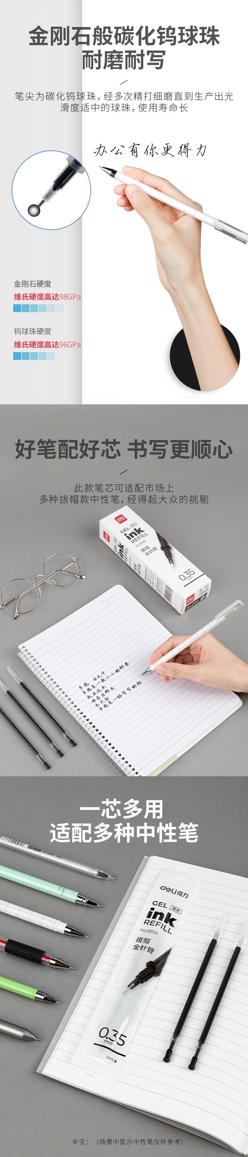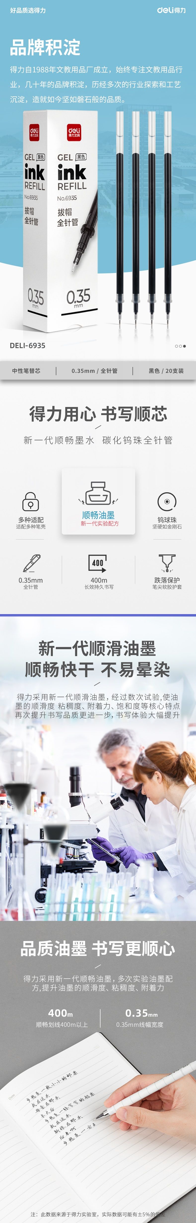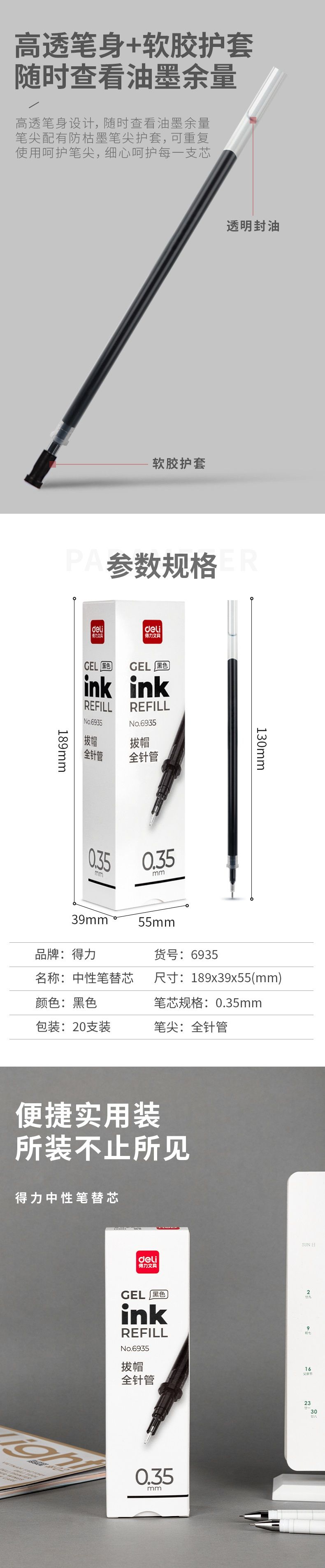 得力(deli)6935 速干中性笔芯 0.35mm 全针管 黑色 20支装 整盒装