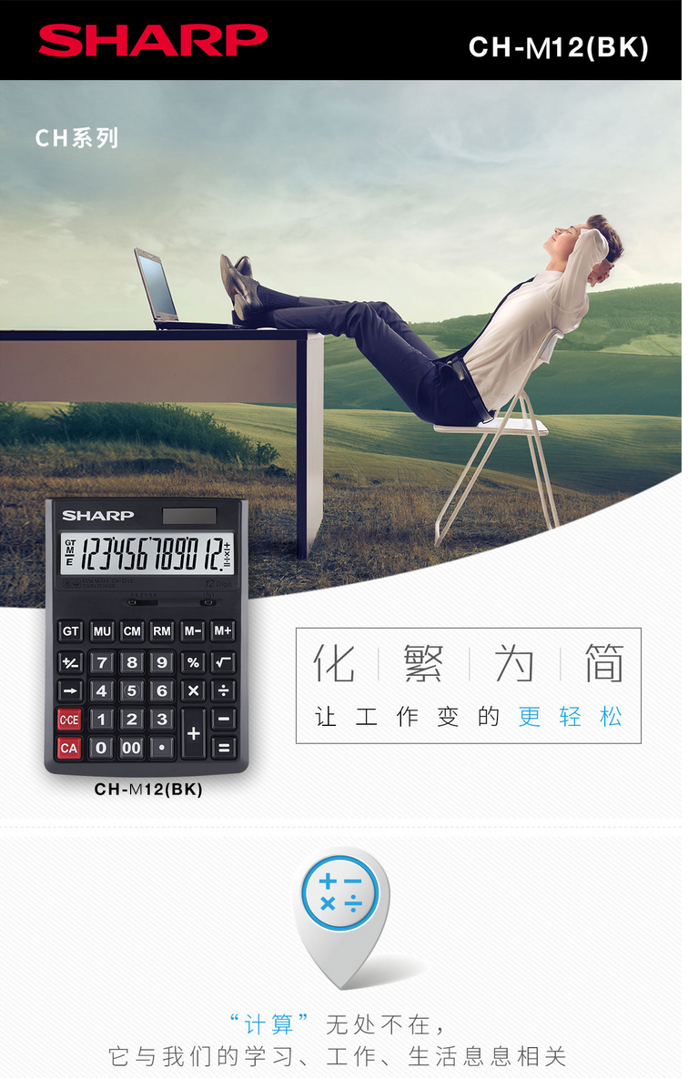 夏普(SHARP)CH-M12 12位小号太阳能办公商务计算器 黑色