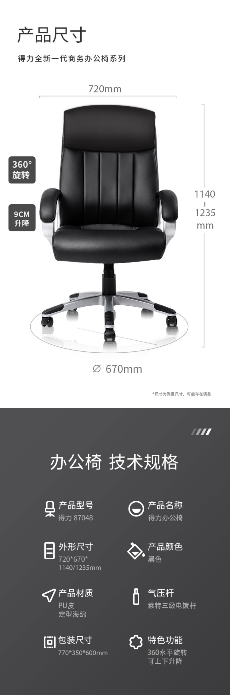得力(deli) 87048 办公椅 商用家用 转椅人体工学皮椅子 时尚升降座椅 老板椅 电脑椅